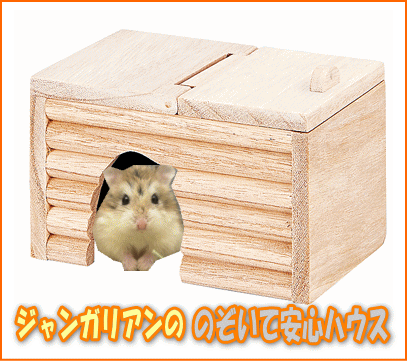 ジャンガリアンハムスターののぞいて安心ハウス サイズ:約幅120×奥行80×高さ85mm(屋根部の取っ手含む) 内寸:(底面部)約W100×D62mm ・開閉屋根つきだから、中の様子がのぞける屋根付きハウスです。